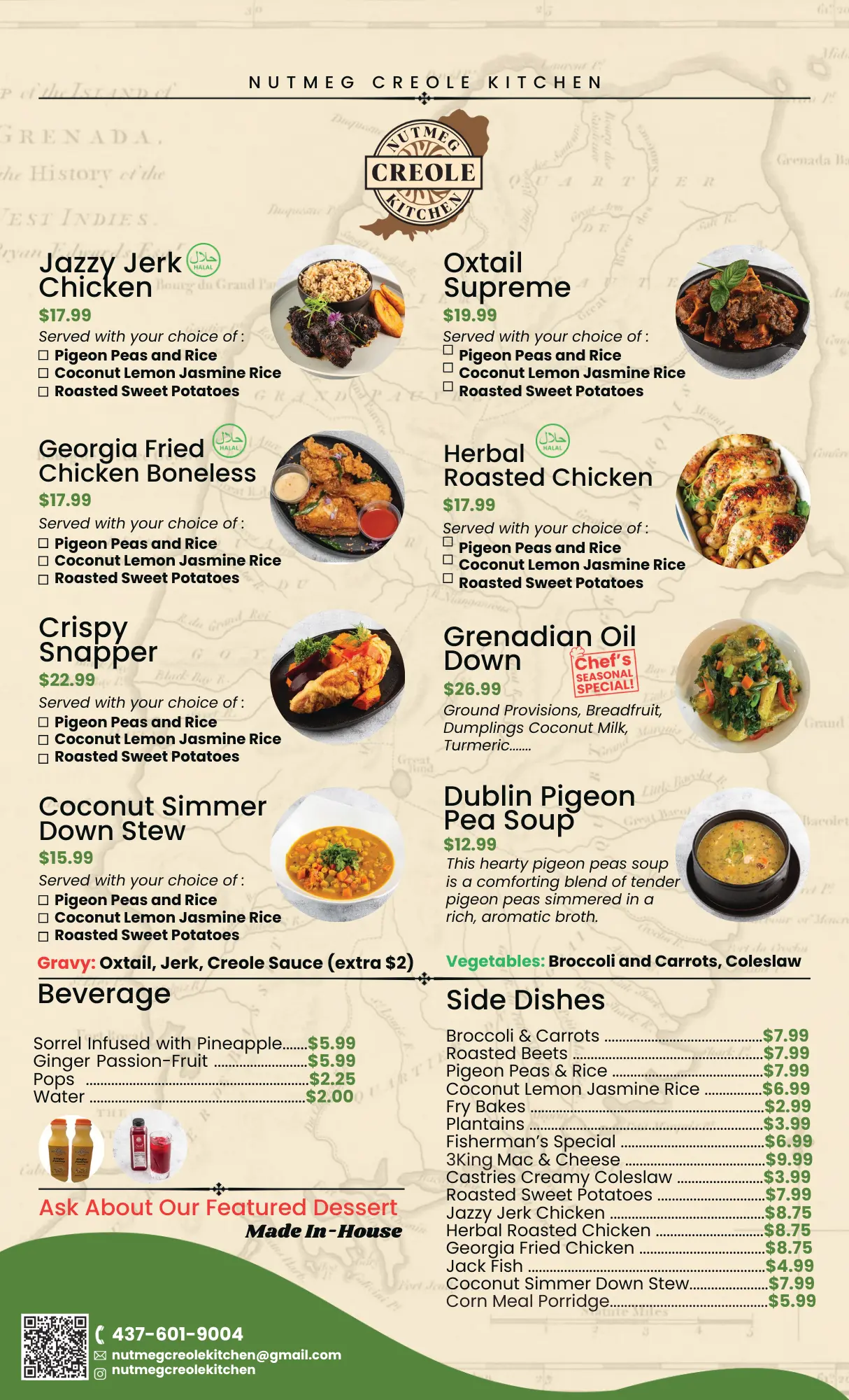 Since 2021, Nutmeg Creole Kitchen has been on a flavorful journey, offering a fusion of Grenadian spices and international culinary expertise. Our passion for creating healthy, quality meals and our dedication to exceptional customer service have made us a trusted name in the GTA food scene. We are proud to announce we are now open at Ghost Kitchen located at 269 Kingston Road E, Unit 1, Ajax, ON, L1Z 1G1. We are ready to serve you with takeaway, delivery, and catering services. Join us as we continue to grow and bring the taste of Grenada to your table.